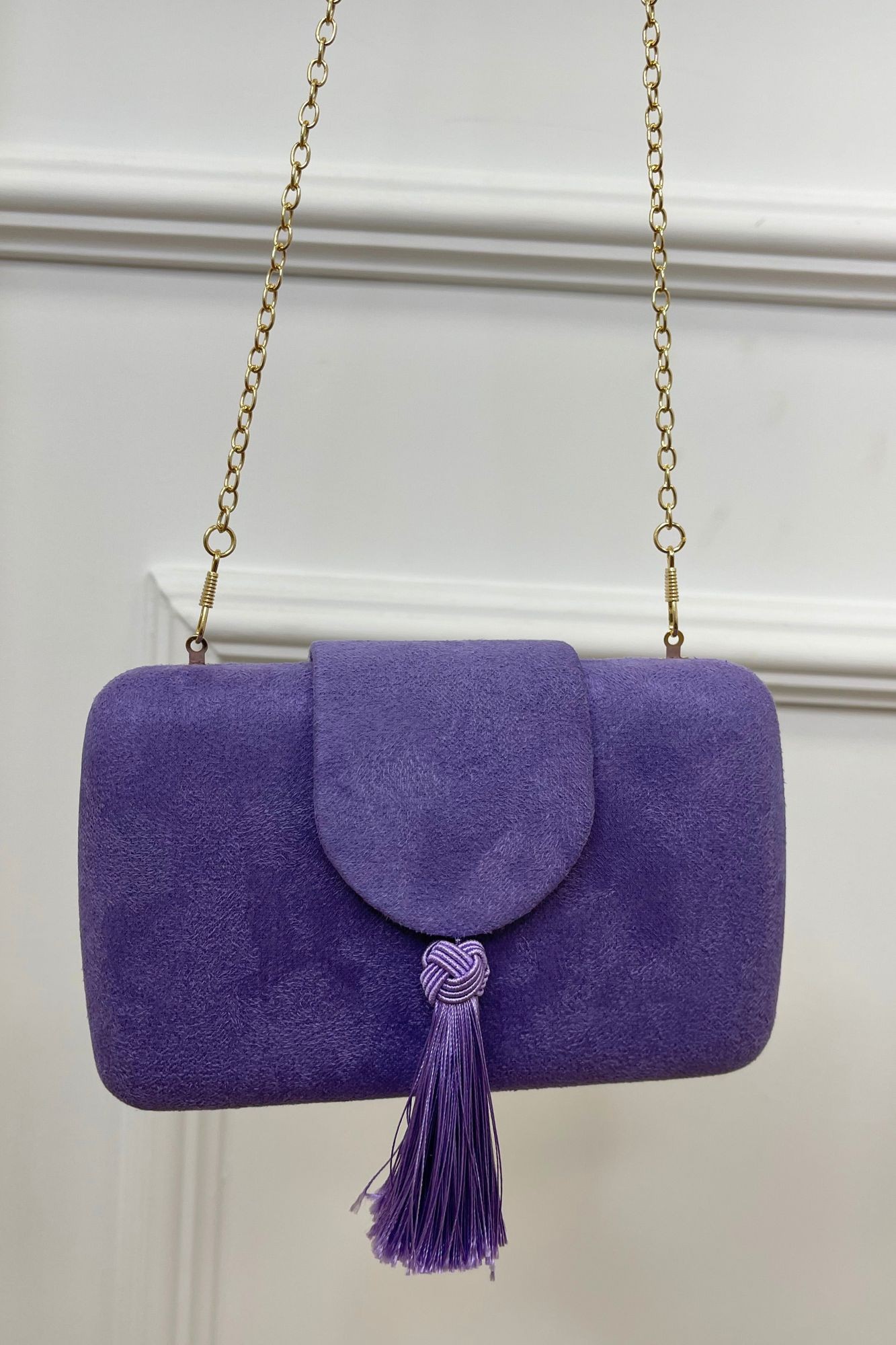 Cartera lila básica con detalle de borla. Cierre con solapa e imán.