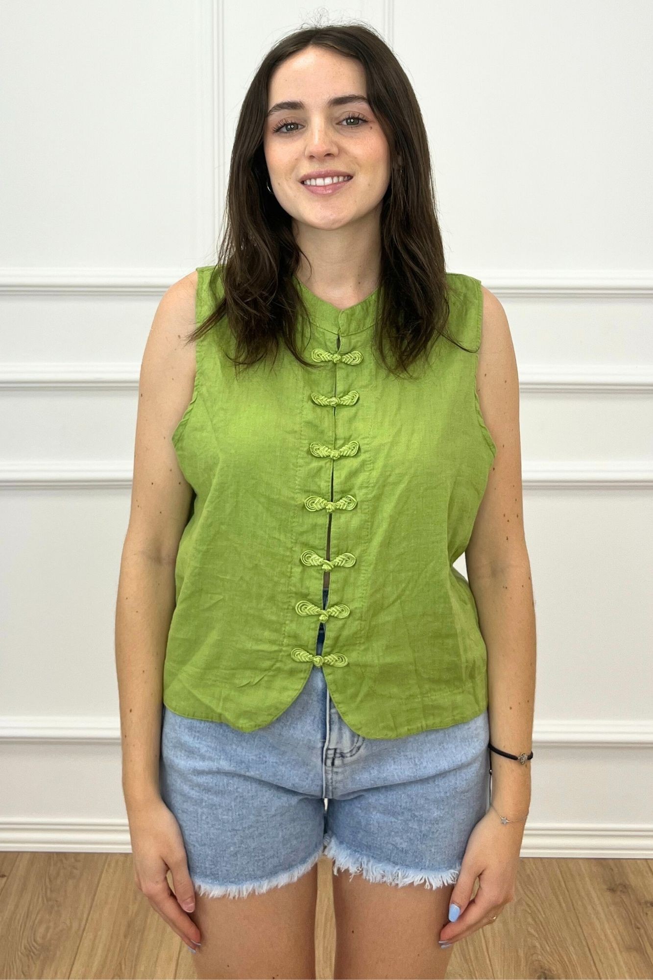 Chaleco abierto de lino con cuello japonés y manga sisa. Detalle cierre con lazada y corchete delantero