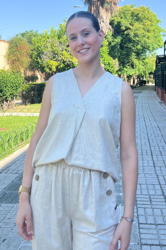 Conjunto en tejido shine compuesto por dos piezas. Blusa larga de manga sisa y escote de pico cruzado. Pantalón palazzo de tiro alto con cintura elástica y bolsillos delanteros con botones decorativos.