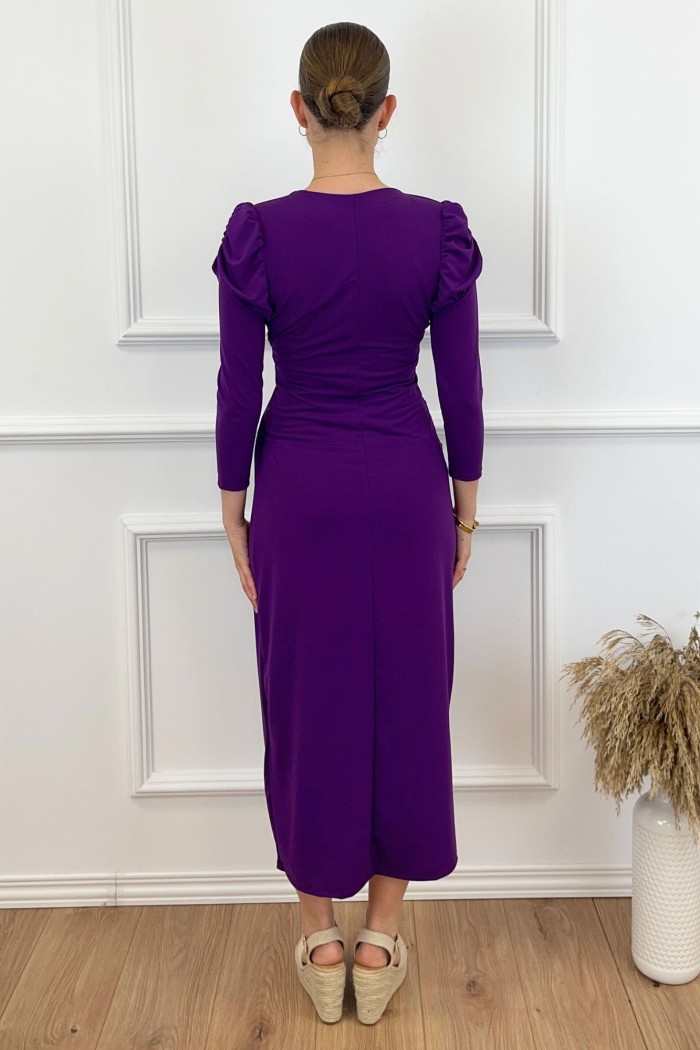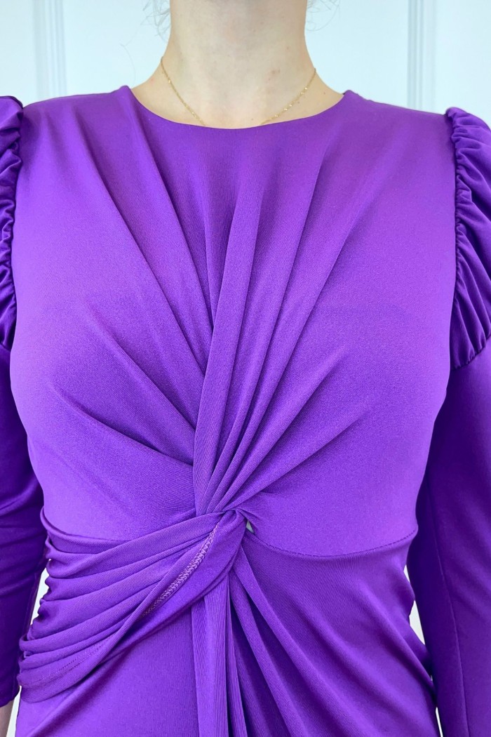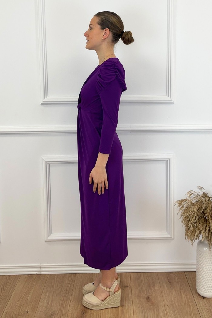 Vestido midi estampado en tejido punto de seda con escote redondo y manga larga fruncida con hombreras. Detalle de nudo y maxi abertura delantera.