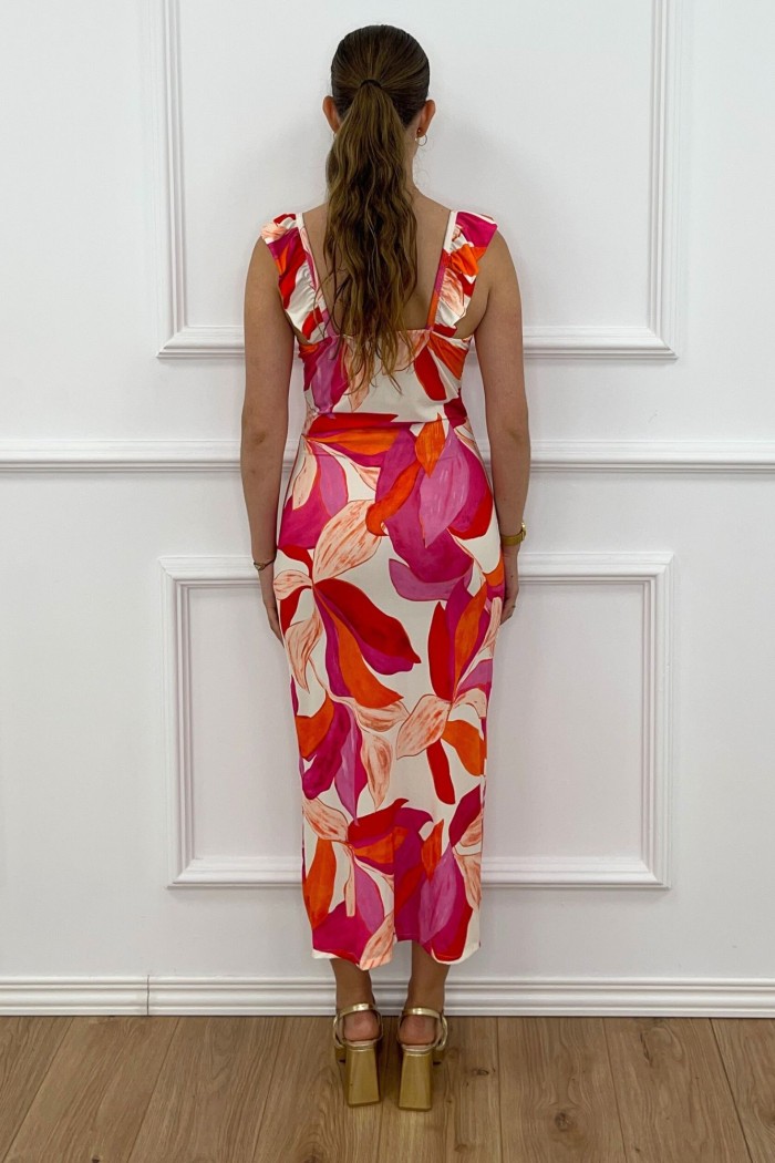 Vestido midi estampado ajustado en tejido punto de seda con tirante fino con volante. Abertura lateral y detalle de foam en el pecho.
