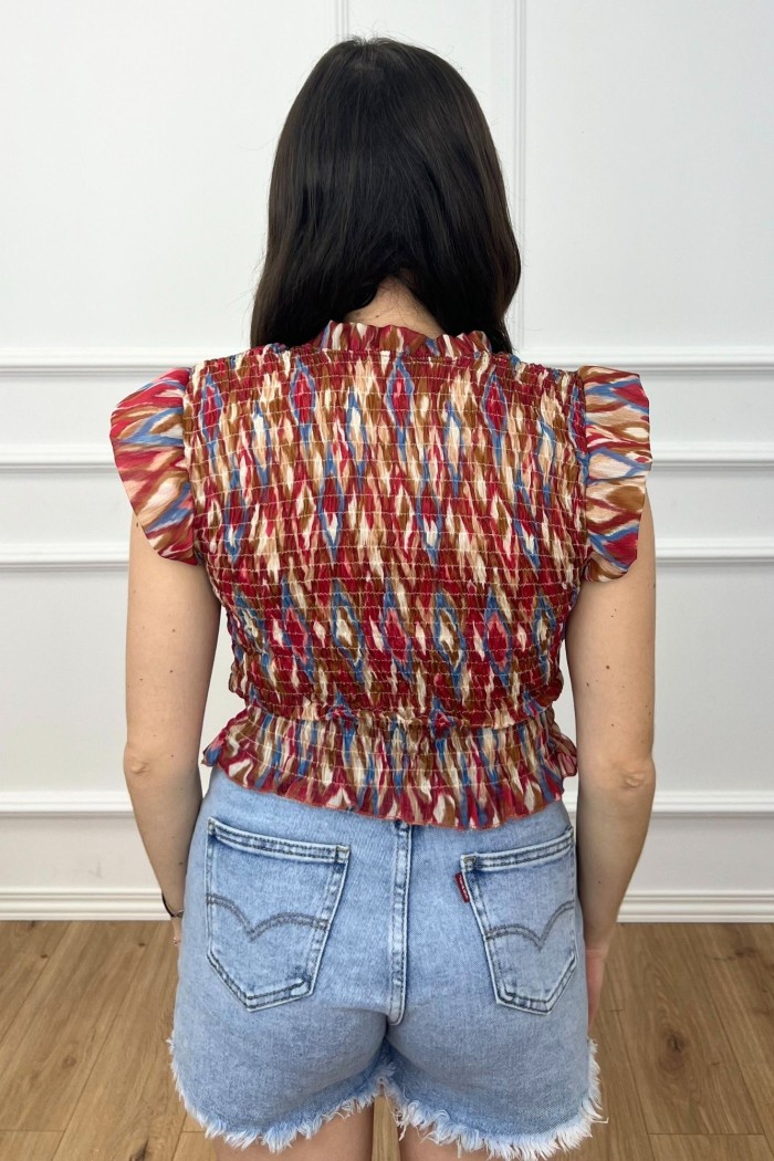 Blusa crop en tejido de gasa con frunce nido de abeja con cuello subido y manga sisa con mini volante.