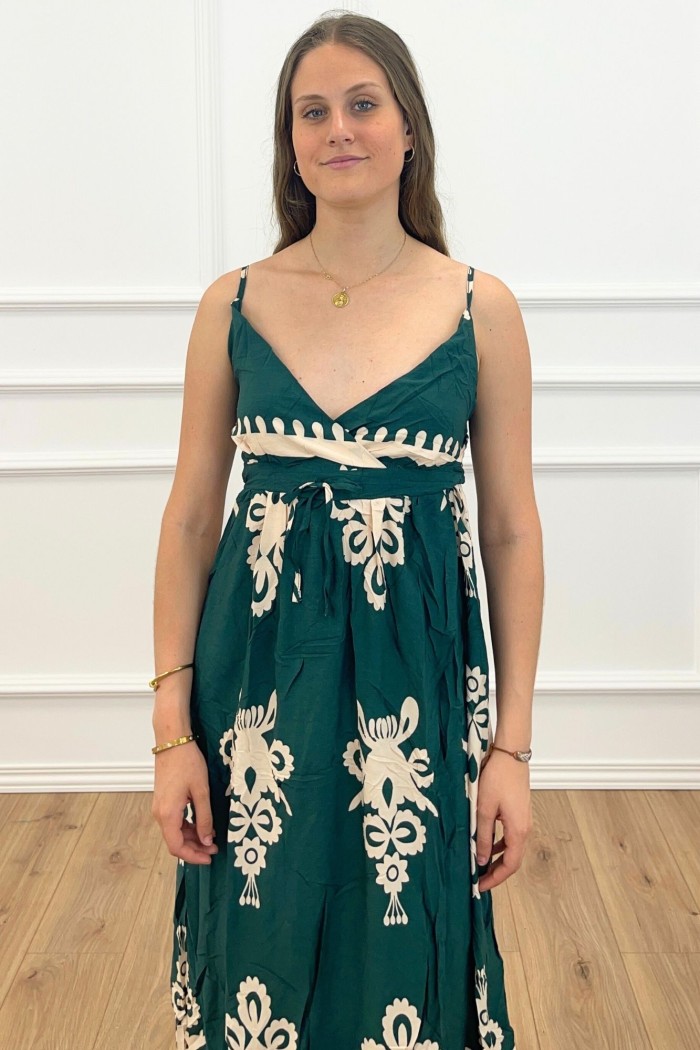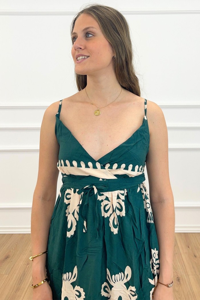 Vestido largo de tejido fluido con escote de pico cruzado y tirantes finos ajustables. Detalle lazada ajustable debajo del busto.