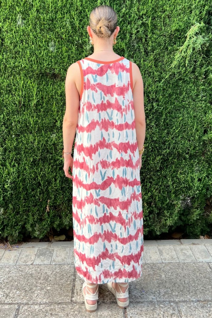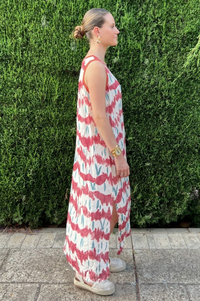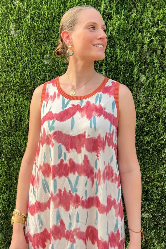 Vestido midi estampado con cuello redondo y manga sisa con terminaciones. Aberturas laterales.