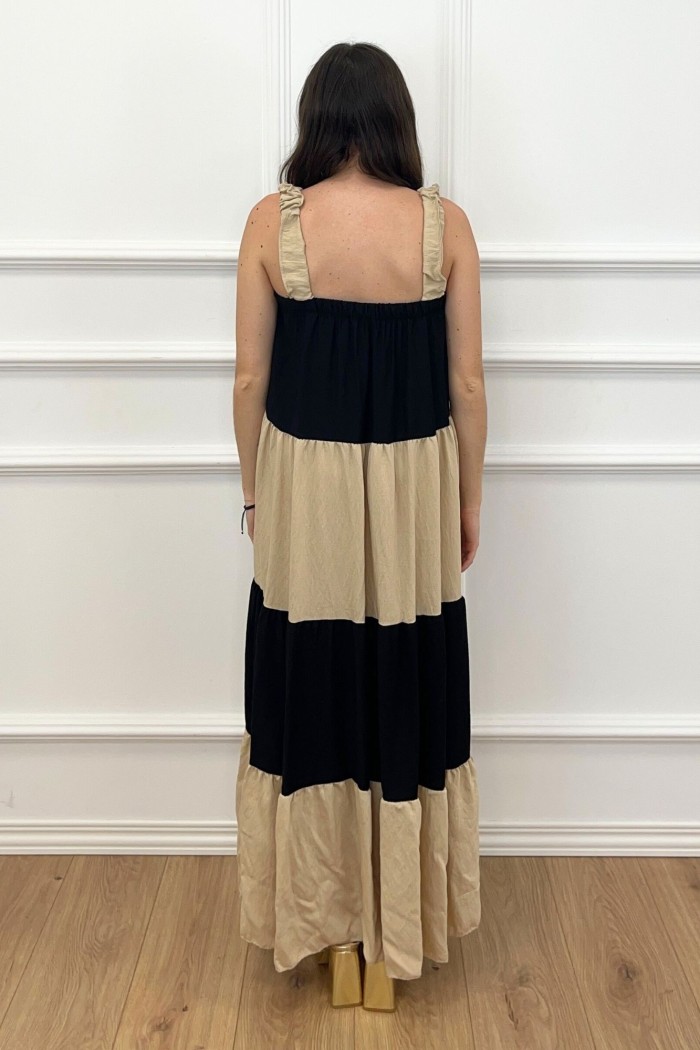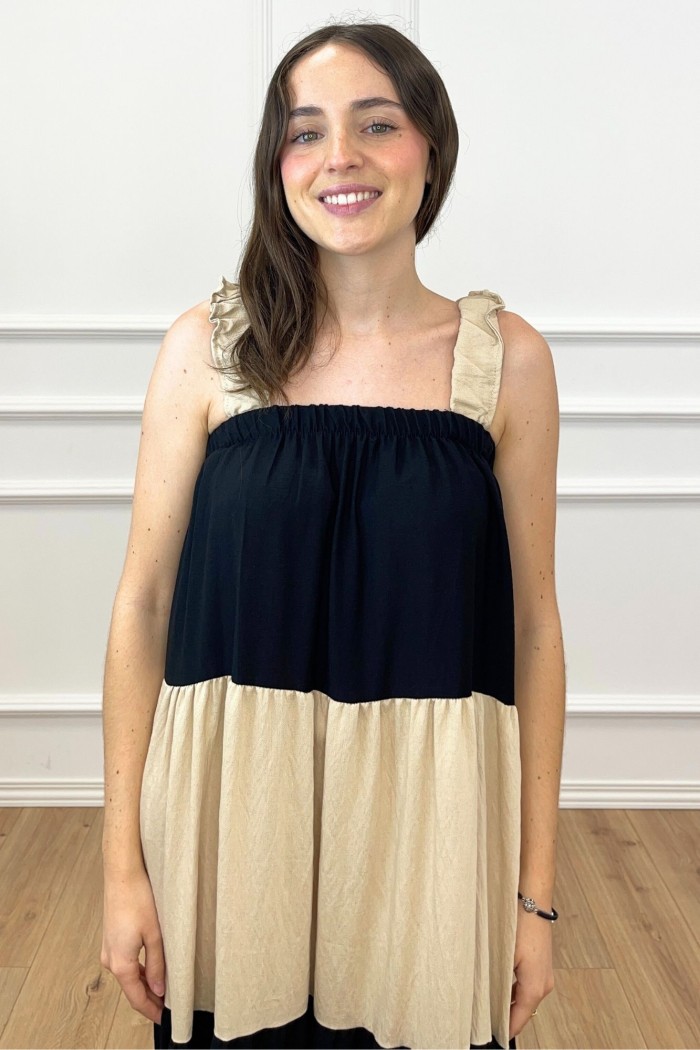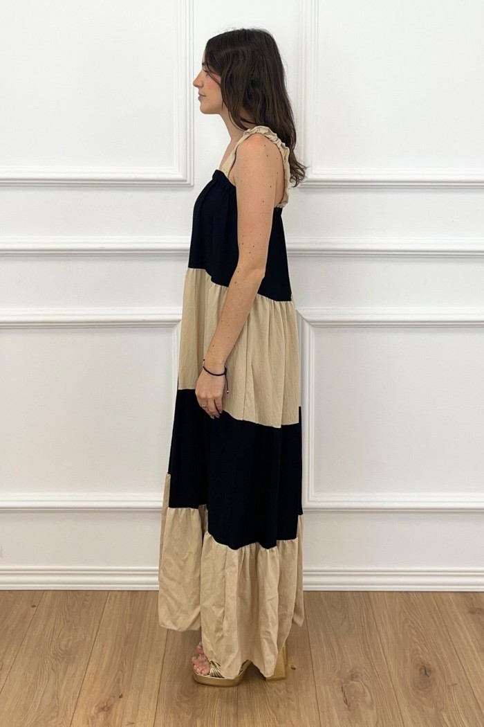 Vestido largo oversize con escote recto y tirante ancho con fruncido. Cuerpo en panales.
