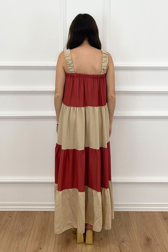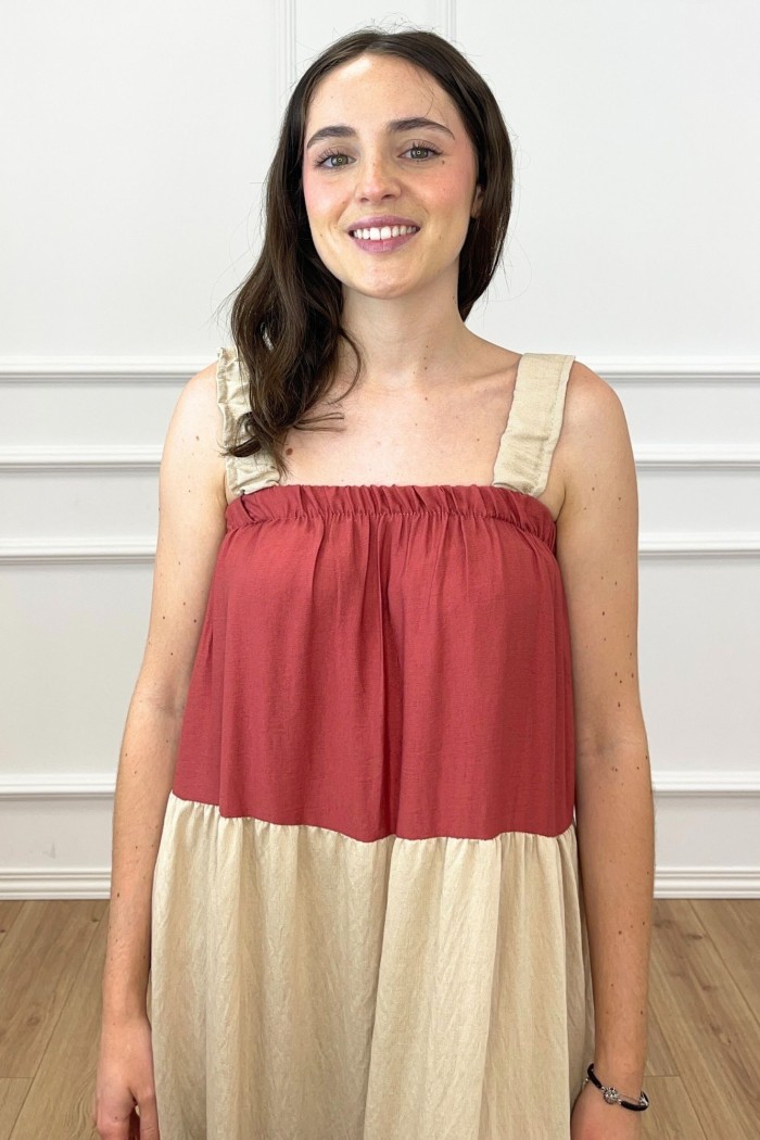 Vestido largo oversize con escote recto y tirante ancho con fruncido. Cuerpo en panales.