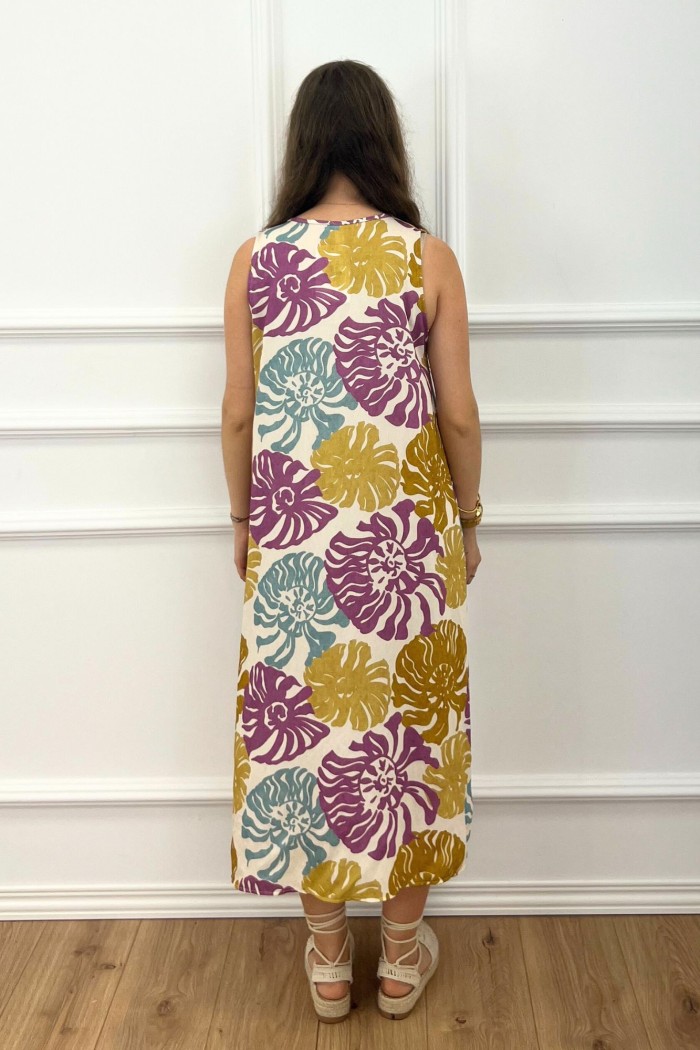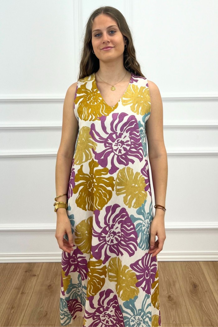 Vestido largo tipo túnica de manga sisa y escote pico.