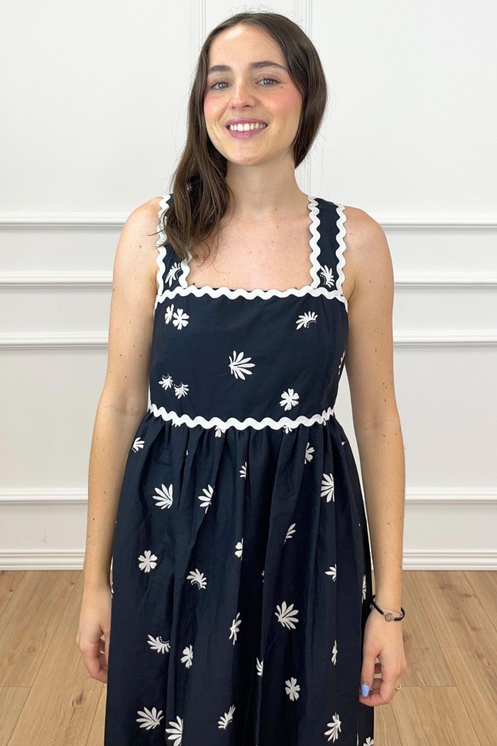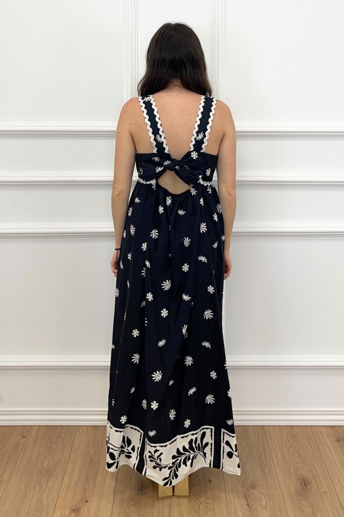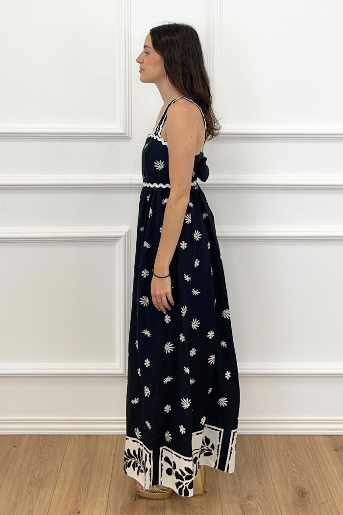 Vestido largo estampado con escote recto y tirante ancho. Detalle de dibujos combinados a contraste. Detalle de espalda con cierre mediante lazada.
