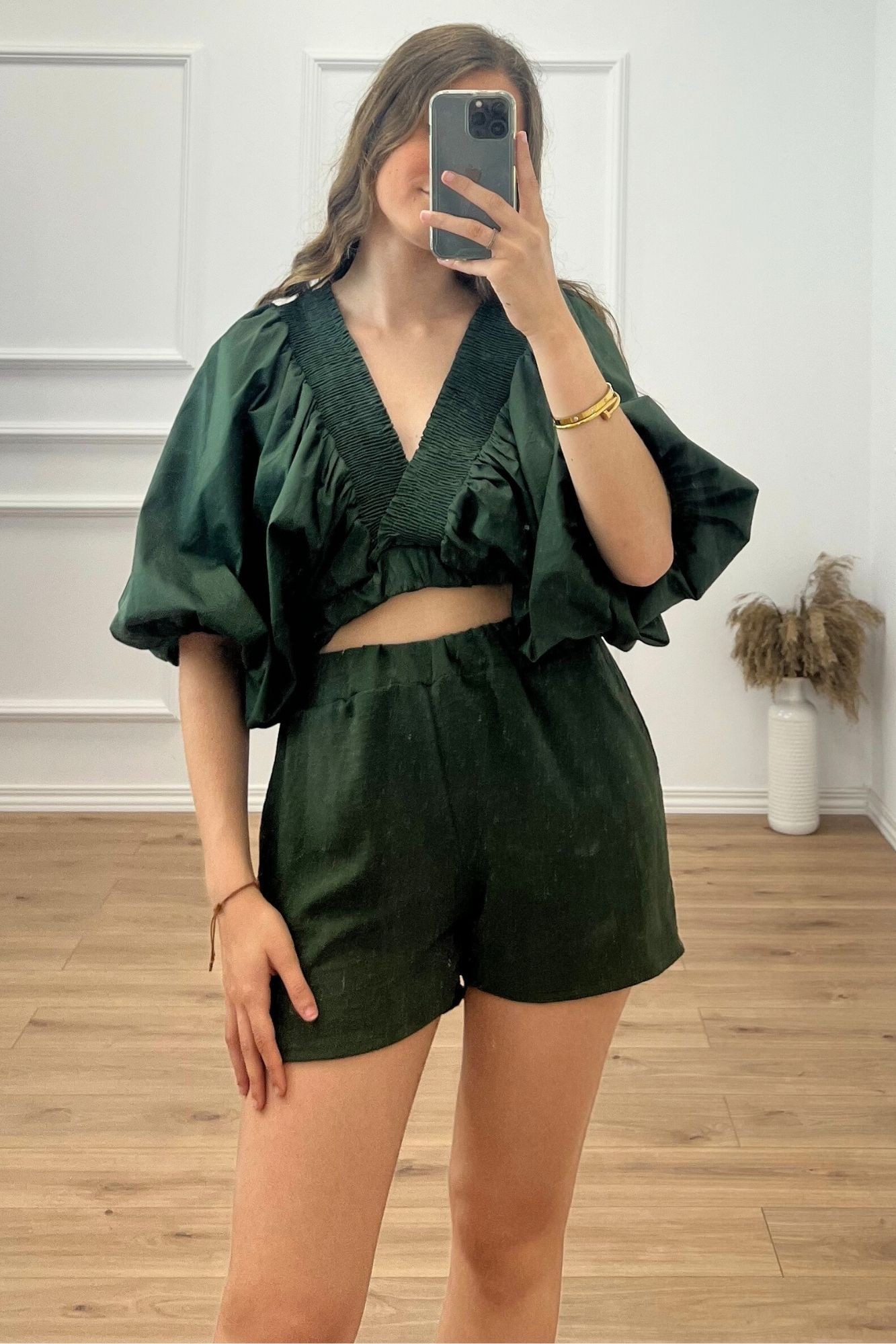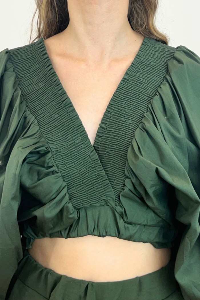 Conjunto de tejido estampado compuesto por dos piezas. Pantalón de tiro alto con cintura elástica y bajo ligeramente acabado flare. Blazer fluida con cuello solapa y manga larga abullonada con tablas. Cinturón en el mismo tejido.