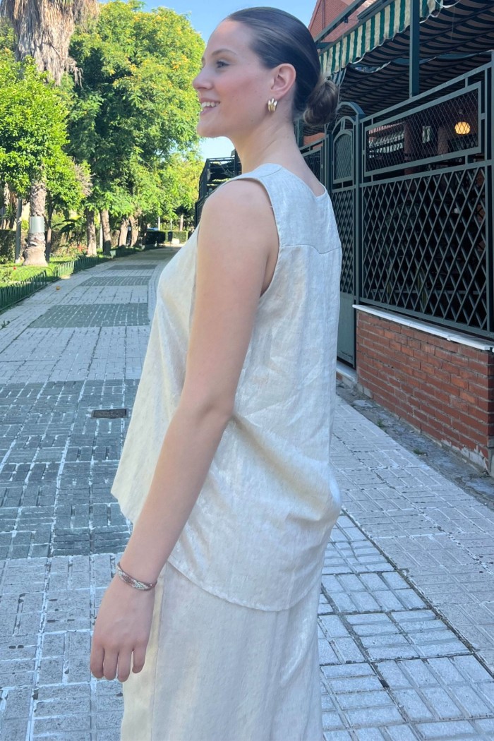 Conjunto de tejido estampado compuesto por dos piezas. Pantalón de tiro alto con cintura elástica y bajo ligeramente acabado flare. Blazer fluida con cuello solapa y manga larga abullonada con tablas. Cinturón en el mismo tejido.