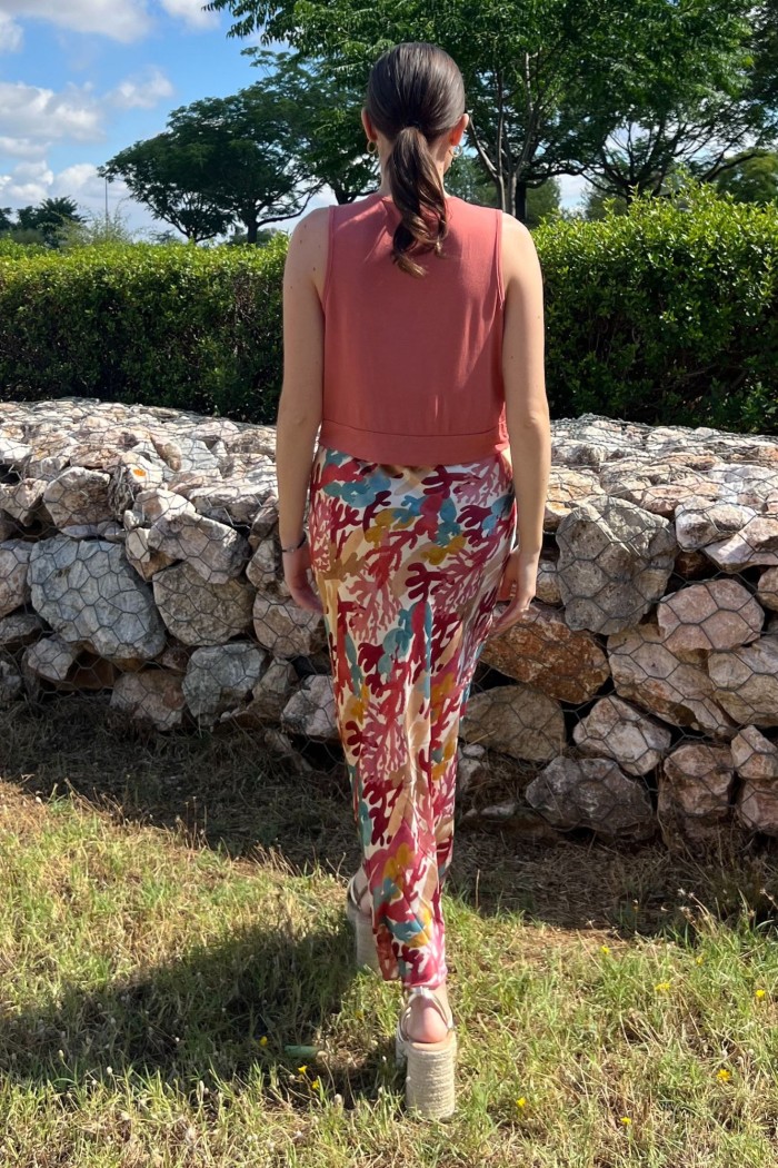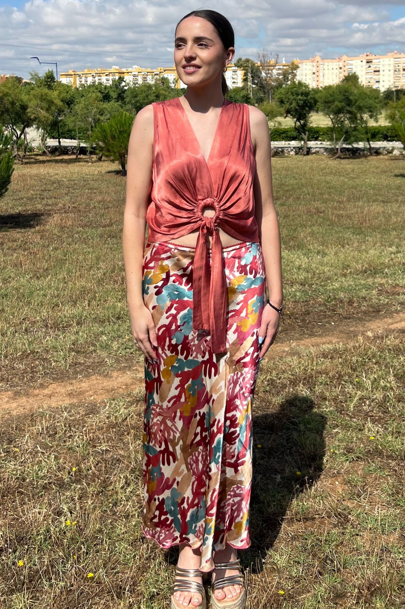 Falda midi de tejido denim y corte clásico con tiro alto y abertura delantera. Bolsillos delanteros y traseros. Cierre frontal con cremallera y botón metálico.