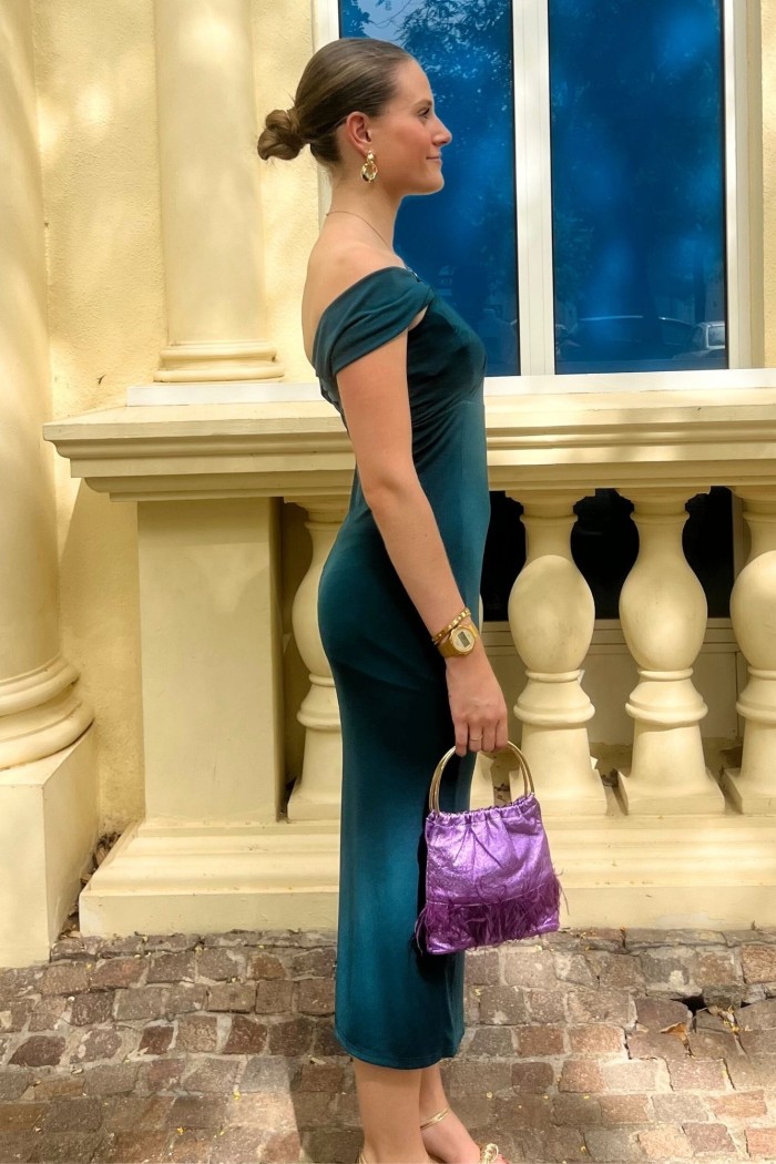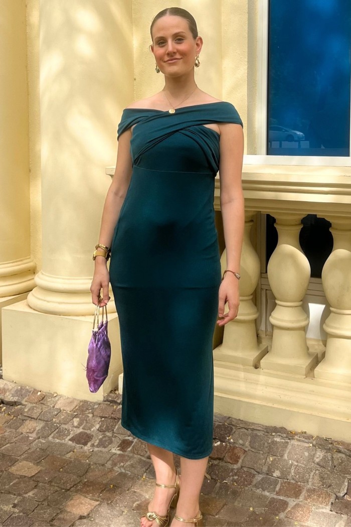 Vestido midi drapeado con cuello barco y manga corta abullonada. Detalle de drapeado frontal con volante. Abertura frontal. Escote trasero de pico. Cierre mediante cremallera trasera. Hecho en Italia