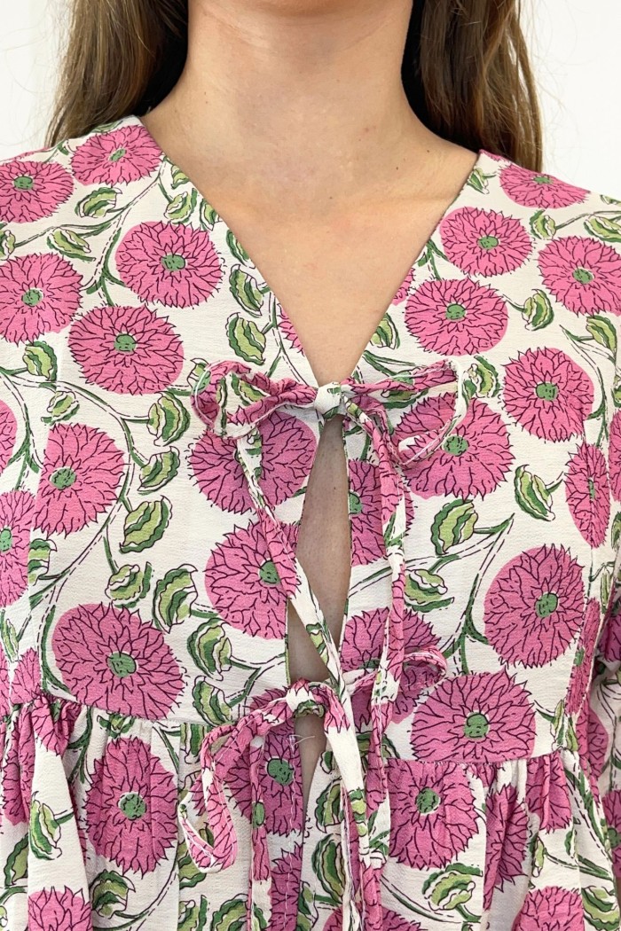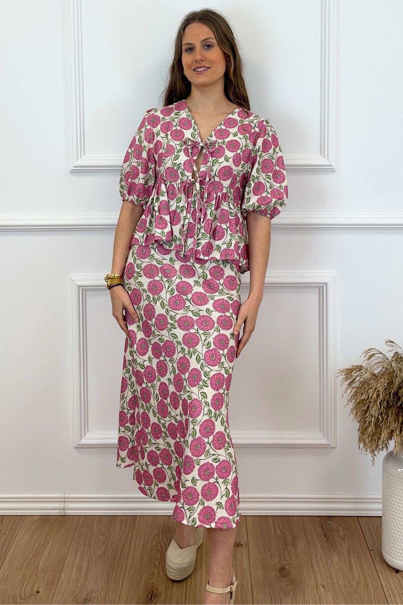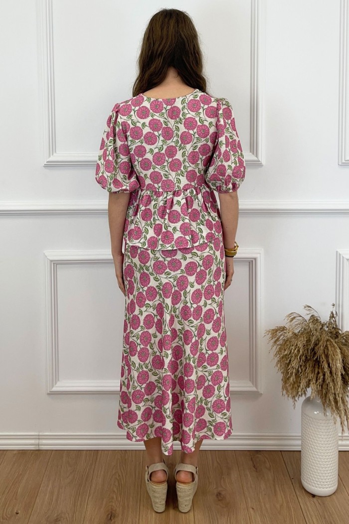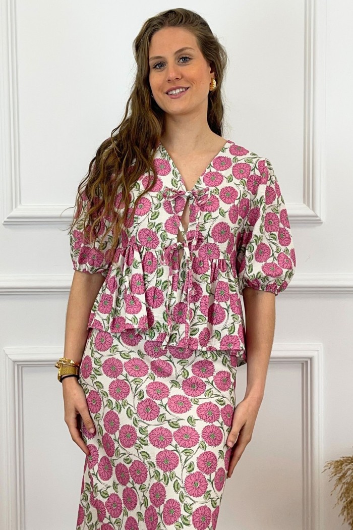 Conjunto de tejido estampado compuesto por dos piezas. Pantalón de tiro alto con cintura elástica y bajo ligeramente acabado flare. Blazer fluida con cuello solapa y manga larga abullonada con tablas. Cinturón en el mismo tejido.