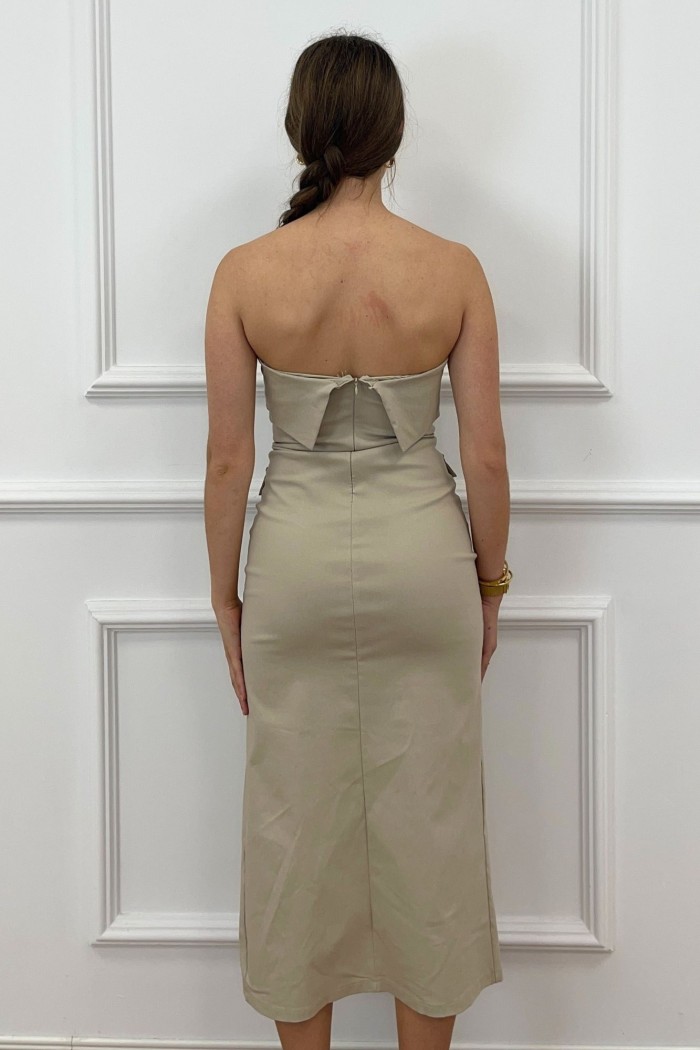 Vestido midi drapeado con cuello barco y manga corta abullonada. Detalle de drapeado frontal con volante. Abertura frontal. Escote trasero de pico. Cierre mediante cremallera trasera. Hecho en Italia