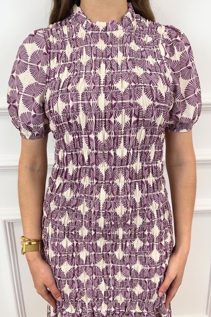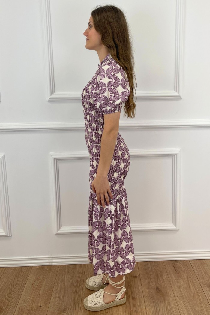 Vestido midi drapeado con cuello barco y manga corta abullonada. Detalle de drapeado frontal con volante. Abertura frontal. Escote trasero de pico. Cierre mediante cremallera trasera. Hecho en Italia
