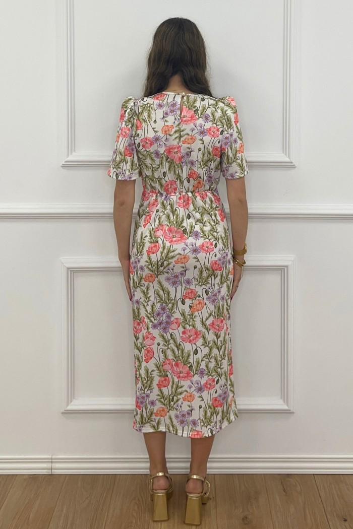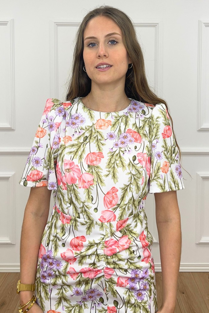Vestido midi drapeado con cuello barco y manga corta abullonada. Detalle de drapeado frontal con volante. Abertura frontal. Escote trasero de pico. Cierre mediante cremallera trasera. Hecho en Italia